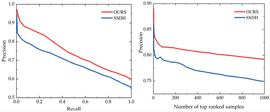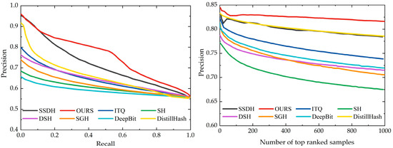 To demonstrate the results of this method, precision–recall curves and top-N-precision curves for this method and the other comparative methods were plotted, as shown in Figure 10. Precision–recall is a good criterion of overall performance and reflects the precision of different recall levels. Top-N precision reveals the average ratio of similar instances in the top-N retrieved instances of all queries, which was calculated by Hamming distance in this paper. Consistent with the mAP results, this paper’s proposed method achieved the best top-N-precision results among all methods. Moreover, the precision–recall curves further demonstrate that the proposed method has better hash search results. The above experimental results all prove the superiority of the proposed method.