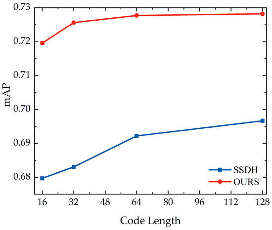 Observing Table 3, when the hyperparameter , the average accuracy is the highest, with better image retrieval capability regardless of whether the code length is 16 bits, 32 bits, 64 bits, or 128 bits. The explanation for this might be that a higher probability of semantic similarity is chosen, allowing the semantics in the picture to be better preserved. In order to verify the accuracy of the proposed algorithm, it was compared with other hashing image retrieval algorithms on the FLICKR25K public dataset. This comparison included three state-of-the-art traditional unsupervised hashing methods, namely ITQ [24], SH [25], and DSH [26], and the deep unsupervised hashing methods SGH [27], DeepBit [28], SSDH, and DistillHash [29] which have been proposed in recent years. The results in Table 4 show that the performance of deep-learning-based algorithms is usually significantly better than that of traditional methods. However, when no proper supervisory signals are found, the powerful representation ability of deep learning cannot be expressed, and its performance may not be as strong as that of traditional unsupervised hashing methods, as in the cases of SGH and DeepBit. In addition, the experimental data also demonstrate that the suggested approach can achieve greater mAP values and more accuracy for a variety of hash code lengths.