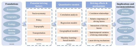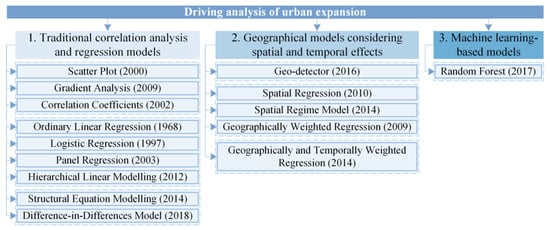 Guan, X.; Li, J.; Yang, C.; Xing, W. Development Process, Quantitative Models, and Future Directions in Driving Analysis of Urban Expansion. ISPRS Int. J. Geo-Inf. 2023, 12, 174. https://doi.org/10.3390/ijgi12040174