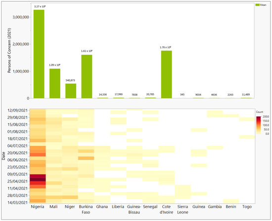 As it becomes evident from this analysis, Nigeria is prominent in the news and is mentioned almost every day as associated with the refugee crisis (see Figure 1). Over 60% of all location mentions in the news articles account for Nigeria. Considering Nigeria’s 3.2 million persons of concern according to the UNHCR (https://data2.unhcr.org/en/documents/download/91265 (accessed on 15 August 2022))—the highest number in the region, the high coverage seems only logical. However, in comparison, other countries in West Africa, such as Cote d’Ivoire, where over 1.7 million people are recognized as persons of concern (https://data2.unhcr.org/en/documents/details/91265 (accessed on 15 August 2022)), are lurking in the shadows of the region’s economic and demographic giant, with only 0.6% of all location mentions in the news articles accounting for Cote d’Ivoire in the 6-month time period.