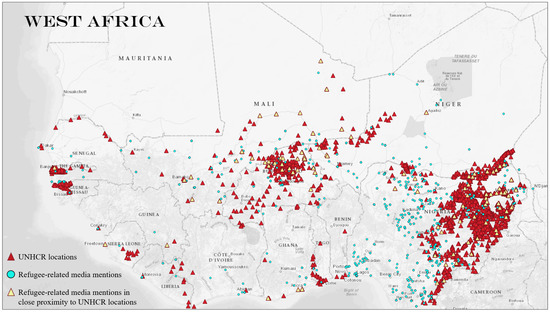 According to a report by the World Health Organization (Available online: https://www.who.int/emergencies/situations/humanitarian-crisis-in-sahel-region-of-africa (accessed on 1 March 2023)), over 33 million people from the Sahel region of West Africa were in need of urgent care in the year 2022 alone as a result of the ongoing conflict, giving rise to one of the fastest growing regional crises in the world. Many regionalized conflicts along state borders in North and West Africa are driven by identity politics, which has caused militant groups such as the Al-Qaeda or Boko Haram to evolve in these regions in recent years [1]. The crisis in the Sahel region began in 2011 when armed groups took control over Northern Mali. By the end of 2019, over 200,000 people had been displaced in Mali, and 900 civilians were killed in over 1300 recorded security incidents. Military-led counter-terrorism operations that were deployed to protect civilians largely backfired as they incited revenge attacks, thus adding to the humanitarian crisis. Over the years, these armed groups have expanded, spreading violence throughout Mali and the neighboring countries. The violence in Mali made its way to Burkina Faso in 2018, resulting in close to 500,000 displaced people. For the first time in its history, Burkina Faso experienced inter-communal and terrorist attacks due to ethnic divisions caused by this regional conflict. In the midst of this crisis, Niger had an influx of people coming in from its southern and western borders. Additionally, an unstable government, banditry, inter-communal clashes, food insecurities, and severe flooding in 2019 resulted in Niger becoming the epicenter of this humanitarian crisis [2]. Those who survived the violence were forced to flee their homes and sought refuge in refugee and internally displaced camp settlements. Despite the urgency of this crisis, the Norwegian Refugee Council in its annual review found the Sahel crisis to be the world’s most neglected displacement crisis in 2019 [2]. Moreover, a lack of political will among the governing bodies, drought, hunger, etc., have caused the situation to worsen over time. Adding to this, misplaced media attention, which tends to focus on the war strategies, fighting between armed groups, or political alliances, was found to be one of the key reasons for the world’s most neglected displacement crisis of 2019 [2], and for the top 10 neglected crises in the subsequent years 2020 and 2021 [3,4]. However, the current state-of-the-art research does not sufficiently present curated news media datasets for this region, to study how the media thematically and spatially covers the refugee crisis in West Africa. Furthermore, studies to systemically identify factors that influence media coverage in West Africa are still very nascent.