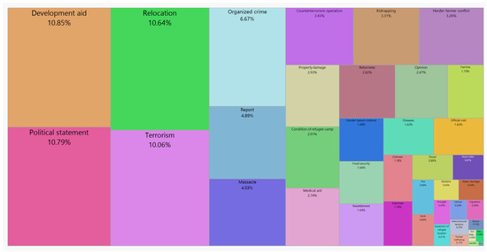 It is also evident from this analysis that most other pressing issues related to the refugee crisis in West Africa, such as famine, access to clean water, or sexual violence in camps, are overshadowed by topics such as development aid, political statements, or terrorism. According to a study by Cadre Harmonisé (https://www.oxfam.org/en/press-releases/west-africa-faces-its-worst-food-crisis-ten-years-over-27-million-people-already (accessed on 1 November 2022)), 27 million people in West Africa were suffering from hunger as of March 2022, and this number was expected to rise up to 38 million by June 2022. However, the topic of famine is reported in only 1.7% of the total 2017 news articles that were considered in this study. Ref. [49] revealed in a case study report for the year 2021 that droughts in West Africa are causing production losses, rising food prices, increasing hunger and malnutrition, and causing herder–farmer conflicts. However, only 0.35% of news articles report on drought, and 0.44% on water shortages and their effects on migration, famine, etc., during the 6 months considered in this study. Furthermore, in an assessment of trafficking risks in internally displaced persons by the UNHCR [50], individual camps across eastern Nigeria showed significant rates of sexual exploitation of camp inhabitants. Often, women under the age of 20 are exploited while they are en route to gather water or firewood. A total of 1.7% of news articles reported on gender-based violence, and 0.2% reported on related human trafficking activities for the whole of West Africa during these 6 months. These are a few examples of what is not covered in depth by the world media in the context of the refugee crisis in West Africa, and as the other thematic classes show in Figure 3, there are many more topics that have received only a little coverage by the news media.