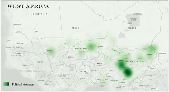 Within the 6 months of news coverage related to refugees in West Africa considered in this study, we found that 96.8% of refugee-related UNHCR locations in the West African region are not mentioned in the news media at all, and the majority of the news articles that did cover the crisis reported mostly on Nigeria, the region’s “demographic and economic giant” [51]. In addition to the middle belt and around the Niger Delta in Nigeria, central Mali, northern Burkina Faso, and Lake Chad form the largest epicenters of violence, according to a study by Trémolières et al. [1]. However, some of these regions are not well represented in the news articles published during the time period considered in this study. The most widely discussed topics such as Political statement or Relocation are mostly linked with locations in Nigeria. In their official reports covering the same time frame, the Norwegian Refugee Council, the UNHCR, and ReliefWeb listed emergency events happening across the region with hundreds of civilians dying due to terrorism and government-run anti-terrorism operations. In their accounts, Burkina Faso even reached its highest number of internally displaced people in the region (https://data2.unhcr.org/en/situations/sahelcrisis (accessed on 1 November 2021)) in this time frame. However, while some of these events are reported, they are largely overshadowed by the bulk of reports on Nigeria. Some significant events (by account of death toll) that occurred during the considered time period but have received little to no coverage are the Solhan attack on 5 June 2021 (https://www.nrc.no/news/2021/june/statement-on-the-solhan-attack/ (accessed on 1 November 2021)), repeated attacks on three villages in Niger that killed 137 people, including refugees https://news.un.org/en/story/2021/04/1088872 (accessed on 1 November 2021), organized political violence in Burkina Faso, Niger, and Mali, for which 70% of the fatalities were estimated to be civilians (https://reliefweb.int/report/mali/sahel-2021-communal-wars-broken-ceasefires-and-shifting-frontlines (accessed on 1 November 2021)), or other major incidents (https://m.reliefweb.int/report/3733886/burkina-faso/burkina-faso-violence-against-civilians-dg-echo-ingos-echo-daily-flash-28-april?lang=fr (accessed on 1 November 2021)) (https://www.voanews.com/a/africa_east-burkina-faso-several-dozen-dead-attack/6205402.html (accessed on 1 November 2021)) in Burkina Faso.