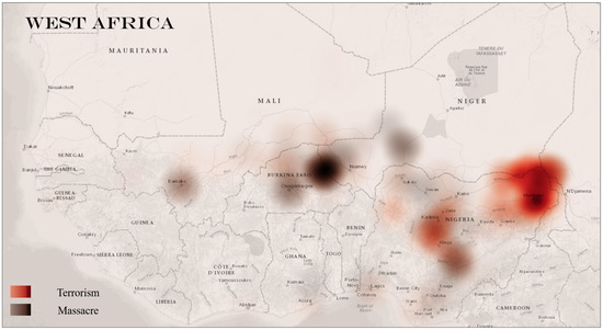 With the help of the thematically annotated classes Massacre and Terrorism, we could identify location hotspots that correspond to news reports about mass killings and terrorism during the considered time period. An overlay of heatmaps corresponding to these thematic classes is presented in Figure 7. Regions reported as affected by mass killings, i.e., Burkina Faso, Mali, and Niger, are clearly visible in grey, while red hotspots show that north-eastern regions of Nigeria and its bordering regions to Niger and Chad are prominently covered in the news while reporting on Terrorism. The difference in the portrayal of the conflict in terms of massacres taking place in Burkina Faso versus terrorism in Nigeria cannot be overlooked.