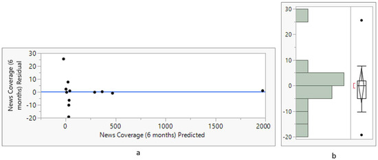 The residual test determines the expected vs. observed values. As can be seen from the graph in Figure 8a, our regression model is good at predicting news coverage below 500 country mentions in a 6-month period. When the residuals are graphed by themselves, as can be seen from the histogram in Figure 8b, it suggests that the residuals are normally distributed with one extreme outlier. As the relationship is approximately linear, we proceed with the assumption that error terms are normally distributed, thereby satisfying the equal spread condition.