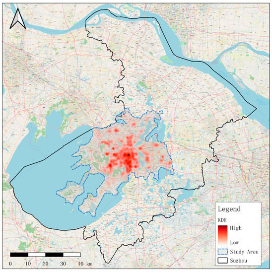Suzhou City is located in the southeast of Jiangsu Province and has the sixth highest GDP in China. It includes many types of areas, such as residential areas, business districts, business centers, high-tech development zones, and so on. We selected four districts of Suzhou, namely, Huqiu District, Gusu District, Wuzhong District, and Xiangcheng District. The number of crimes committed in these four regions amounts to 80% of the whole city, for which hotspots were generated in the data-preprocessing stage, while there were no hotspots generated in other regions. Thus, we selected these four districts and eliminated any water-covered area to create our study area. Figure 1 shows the kernel density estimation of crime data in the study area from December 2011 to October 2013.