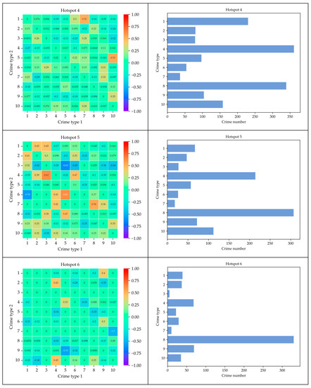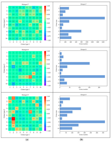 Figure 3 shows the correlation coefficient of each crime type in every crime hotspot area and the proportion of each crime type in each hotspot area. Figure 3a show the correlations between crime types. The abscissas in the graphs indicate crime type 1, while the ordinates indicate crime type 2. The Figure 3b show the distribution of the number of crime types in the hotspot areas identified.