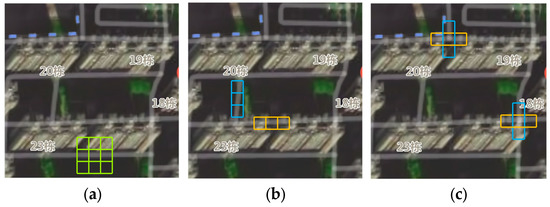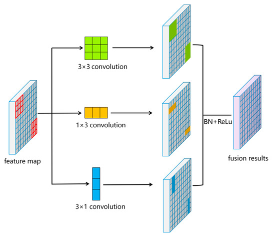 - Asymmetric convolutional block (ACB). Existing neural network models typically extract features within the square window using the square convolution kernel, which is feasible for most block-shaped objects and spatial region blocks. However, the community roads in our study are narrow strips whose directions mainly extend vertically and horizontally. Using the square convolutional kernel can hardly focus on extracting linear features of the roads. In addition, the community has many road intersections, most of which are in the shape of “crossings” and “T-junctions.” Due to the lack of direction sensitivity in square convolutional kernels, they cannot concentrate on extracting road information in different directions at intersections and geometric shape features of intersections. The nonlinear features of roads are generally manifested as complex geometric shapes such as curves, loops, and irregular edges. It is difficult for square convolution kernels to adequately extract nonlinear features of different scales and shapes. Moreover, the importance of features captured by square convolution kernels is heterogeneous. Specifically, the central crossover location contributes more information to feature extraction and less to the corners [36], which will cause the information extracted by the square convolution to be redundant and unrepresentative, further weakening the model’s ability to extract nonlinear features. To overcome these limitations of the square convolution kernel, we choose the three-branch convolutional block (ACB) with cross-receptive fields shown in Figure 3 to extract the spatial features of the community roads. As shown in Figure 4, in ACB, the 3 × 3 convolution kernel is used to capture the contextual information of the road, and the 1 × 3 and 3 × 1 convolution kernels pay attention to capturing the road’s linear characteristics, the intersection’s geometry, and the representative linear and non-linear features at the skeleton. Thus, ACB reduces the capture of redundant information, ensures the extraction of essential road and intersection features, enhances the extraction of representative nonlinear features, and maintains sensitivity to contextual spatial features. The ACB is expressed as follows: