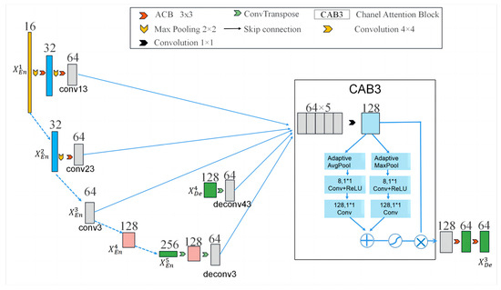 - Multiscale features skip connection and fusion. Considering that the insufficient information flow extraction and utilization limit the original U-Net architecture’s potential, we incorporate multi-scale jump connections into the U-Net to facilitate interaction between encoders and decoders and to fully capture fine-grained road location, geometric and topology features, and coarse-grained semantic features. Figure 4 shows how generates its feature map. The first step is the multi-scale features skip connection. Firstly, the same-level encoder layer’s (i.e., ’s) feature maps are concatenated. Subsequently, the transposed convolution and ACB transmit the lower-level decoder layers’ (i.e., ’s and ’s) fine-grained road geometry and topology features. Finally, the max pooling layer and ACB deliver the higher encoder layers’ (i.e., ’s and ’s) coarse-grained road semantic information. This process can be expressed as follows: