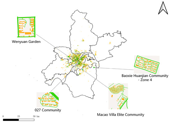 - For remote sensing data, the internal environment of residential communities is complex, and many types of elements, such as buildings, trees, and lawns, obscure the confined branch roads in the remote sensing images of the communities, thus posing a challenge for extracting fine community branch roads in community space.