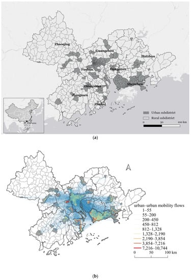 This study investigated the spatial structure of the UUM and URM networks in the PRD area in South China, which is the essential component of the Great Bay Area in the mainland, consisting of nine prefecture-level cities: Guangzhou, Shenzhen, Foshan, Dongguan, Huizhou, Zhuhai, Zhongshan, Jiangmen, and Zhaoqing. Since 2000, the PRD area has gradually won the position of a manufactural center in the global supply chain, growing into one of the most developed areas, with a premier urbanization rate and infrastructure construction intensity in China. Intensive, polycentric, urbanized spatial layouts have laid the foundation for an integrated development strategy in the PRD. Nevertheless, deep contradictions in the disorderly expansion of urbanization, the incoordination of urban–rural development and pressures on ecology have challenged its sustainable development. Hence, we attempted to clarify the underlying mesoscale structure, to aid the local government and policymakers with the insights into urban–rural interplays and integration.