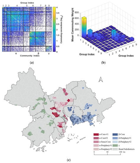 Figure 3a depicts the heatmap of the inter-subdistrict adjacency matrix weighted by aggregated mobility connections of 324 urban subdistricts inside the PRD area, with columns and rows sorted by the grouping index and degree centrality within each group. By comparing the network structure in