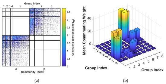 Figure 3b, therefore, intuitively represents the concrete inter-group matrix with a vertical axis weighted by the mean of the mobility connections among subdistricts within the group.