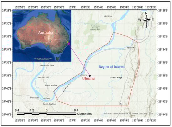 Study area location within New South Wales, Australia. The red polygon is Ulmarra, the region of interest, and its surrounding area.