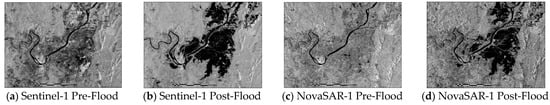 Remote sensing techniques have been proven to provide valuable information for monitoring and rescue operations in the event of floods in a time- and cost-efficient manner due to their synoptic view [4]. The synthetic aperture radar (SAR) is one of the most used satellite-based systems in recent years due to the increased availability of high spatio-temporal resolution imagery, its frequent revisit capability and its ability to capture data from targets on the earth’s surface in nearly all weather conditions and during any time of the day [5,6,7,8]. A SAR sensor not only offers advantages in all weather conditions but also enables shape distinctions between water and land [9,10,11].