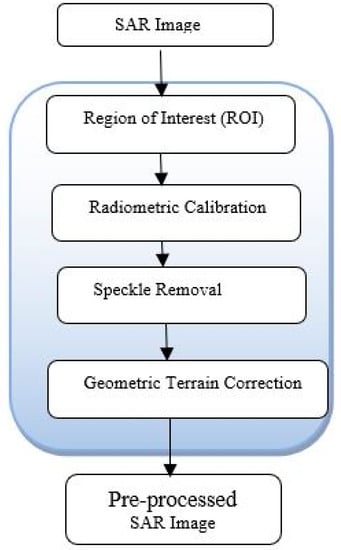 Given the inherent speckle noise and geometric errors often associated with SAR data, the need to improve data quality to achieve robust performance metrics cannot be overemphasized. SNAP 8.0 (Sentinel Application Platform) was used to perform the pre-processing tasks (Figure 3). Both Sentinel-1 and NovaSAR-1 were collected in UTM Zone 56J/WGS84 coordinate systems, which consequently facilitated the creation of the intersections for all images. We clipped all data to the study area by creating subsets using the SNAP toolbox. We also applied radiometric calibration to calculate the sigma nought values; however, this step did not apply to NovaSAR-1 as datasets emitted by the SSTL-Image Formation Processor-IFP are fully radiometrically calibrated images. Speckle reduction was performed using multi-looking processing parameters to minimise the effect of noise. Furthermore, geometric Doppler terrain correction was performed by applying SRTM 3s DEM to easily oversee geometric errors due to the side-looking geometry of the SAR systems. The co-registered sigma nought datasets of Sentinel-1 VV and NovaSAR-1 HV polarisations were exported as one band Geotiff image file for CNN-based deep learning techniques as shown in Figure 2.