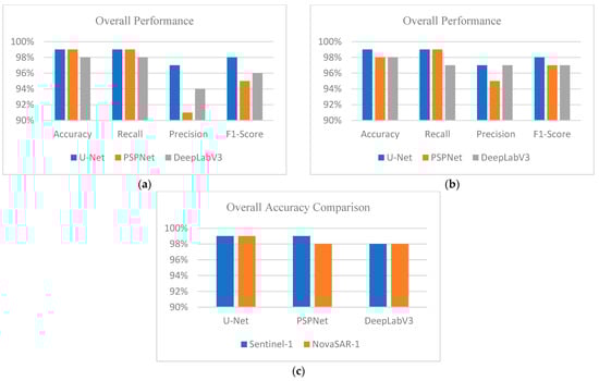Training results: (a) Sentinel-1 binary classification; (b) NovaSAR-1 binary classification; (c) overall accuracy comparison for Sentinel-1 and NovaSAR-1.