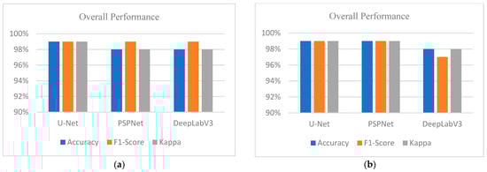 Statistically, inference was performed on the trained models using the Sentinel-1 and NovaSAR-1 datasets, and, as can be seen, the models achieved good test results with a 99% average overall accuracy, as shown in Figure 8a,b below. Specifically, the 99% average overall accuracy obtained for U-Net + 152 in Figure 6c during the model training is consistent with that achieved during the testing stages. Overall, the results in Section 3.1 and Section 3.2. compare well and further demonstrate the generalisability of the models.