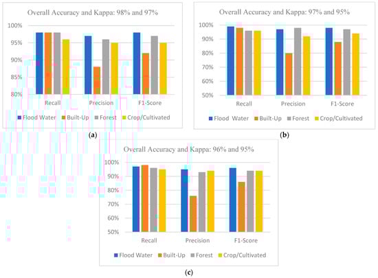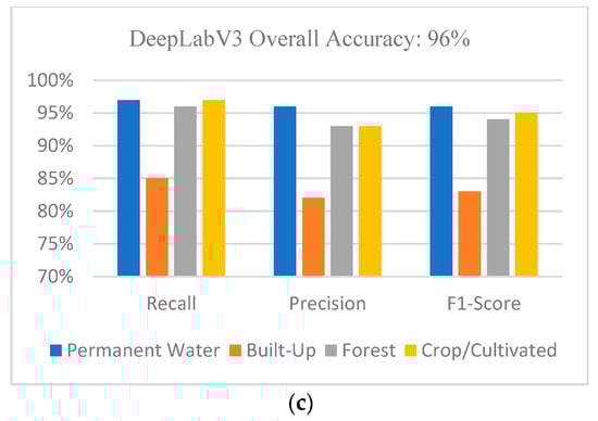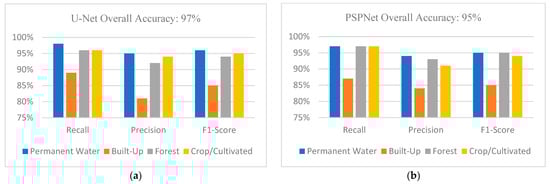 Figure 6a,b represent the model training results for the Sentinel-1 and NovaSAR-1 pre-flood datasets, respectively. The main differences between the two sets of SAR data are the polarisations, ground resolutions and sensing periods. As can be seen, the models do not show any significant difference in performance. After training each model separately, U-Net + ResNet 152 achieved a marginally higher average overall accuracy and showed strong recall/precision statistics in the extraction of permanent water pixels. In addition, the three models achieved strong recall, precision and F1-score statistics, which implies that there were a few missing water pixels in our prediction, thus decreasing the amount of manual cleaning that was performed. Overall, Figure 6c summarises the overall accuracy of the two training datasets. As can be seen, NovaSAR-1 compares well with Sentinel-1 in overall accuracy, except for the 1% loss during PSPNet model training.