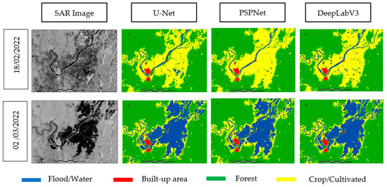 Therefore, the main objective of this paper was to compare the accuracy and prediction performance of three CNN encoder–decoder models (i.e., U-Net, PSPNet and DeepLabV3) for automatic flood mapping using NovaSAR-1 and Sentinel-1 data. This approach consists of annotating and training each CNN model separately on these publicly available dual-polarised pre-flood data (i.e., NovaSAR-1 and Sentinel-1) based on the ResNet convolutional backbone using a transfer learning approach and testing the generalisability of each trained model on post-flood datasets.