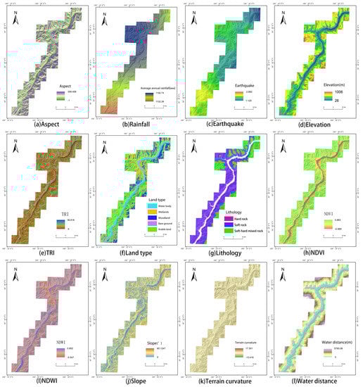 These 12 landslide factors were selected because they are widely recognized as among the major factors influencing landslide occurrence and have been extensively explored in past studies. For example, many studies have shown that factors such as high elevation, steep slopes, south-facing slopes, and hydrologic conditions increase the risk of landslides. In addition, many studies have explored the relationship between vegetation cover, landform curvature, seismic activity, and other factors and landslides [38,39,40].