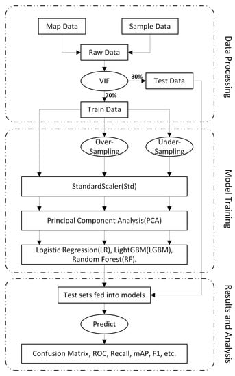 The first step in the workflow is to complete the data preparation. Firstly, the landslide sample point data are combined with the geographic information of the study area to obtain the original dataset, which is done so that it is clear which location in the study area is represented by the landslide susceptibility of a certain sample point after the training is completed. Then the dataset was subjected to a VIF test to check whether collinearity existed in the features of the selected samples. Finally, the dataset is divided into 70% training set and 30% test set. The 70/30 split is a commonly used ratio, but it is not a hard and fast rule. This step uses the train_test_split method in the Sklearn toolkit to divide the dataset after setting the division ratio and related parameters.