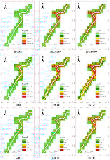 Using Logistic Regression, Random Forest, and LightGBM algorithm models, three sampling methods (original dataset, under-sampling dataset, and over-sampling dataset) were applied, respectively, to make landslide susceptibility predictions. The 12 landslide factors mentioned in Chapter 2 were selected as input variables in this study, such as elevation, curvature, aspect, NDVI, NDWI, slope, distance to river, rainfall, land use, earthquake power, topographic roughness index (TRI), and lithology [19], as inputs. Furthermore, the predicted values obtained are 0 and 1, via the Landslide Prediction Index (LPI). Finally, the predictions of the nine models for the landslide samples were derived and combined with the geographical information of the study area to obtain a picture of the landslide susceptibility of the area. It is shown in Figure 4.