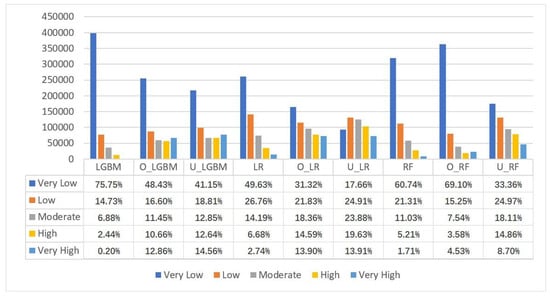 LR often handles regression problems where the dependent variable is categorical. The dependent variable of logistic regression can be binary or multiclass. In order to avoid overfitting, the regularization method is introduced in Logistic Regression. The regularizer increases as the complexity of the model increases; the more complex the model, the higher the regularization term. LGBM (Light Gradient Boosting Machine) [41,42] is a framework that enables the application of the GBDT (Gradient Boosting Decision Tree) [42] algorithm, supporting efficient parallel training. Moreover, it boasts a faster training speed, lower memory requirement, enhanced accuracy, distributed support capability and faster processing of large amounts of data. It is usually used for CTR prediction, multi-classification, sort search, and other tasks. RF is a particular Bagging [16] method that uses the Decision-Trees models in Bagging. First, some training sets were developed by Bootstrap [43]. Then, per the training set, a Decision-Tree is constructed. The Random Forest has the idea of integration in which samples and features are sampled to avoid overfitting. We found that RF classifiers always lead to good models, as in a landslide susceptibility prediction article that finally found that RF classifiers worked best [44].