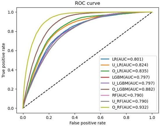 Figure 6 shows the ROC curves of the nine trained models. The AUC indices of the three models are sorted by original data, under-sampling, and over-sampling. From the ROC curve, the sample equilibrium model is superior to the original unbalanced data model. The model with the highest AUC value was the RF model with the over-sampling method (AUC = 93.2%).