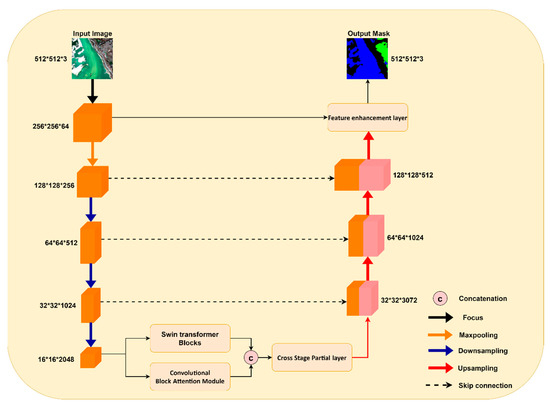 In this paper, two different attention mechanism modules, the Swin Transformer [42] and CBAM [43], are used to build the MA module, which fully exploits the distinct advantages of the two modules for feature extraction and strengthens the connection between global and local features. As shown in Figure 1, the MAAFEU-net consists of three main components: the backbone network with the addition of Focus, the MA module to enhance feature extraction and the feature enhancement layer to further process the upsampled feature maps. Firstly, considering that the backbone network ResNet50 loses more feature information for the downsampling of the original image at the beginning, Focus is used instead of the convolution operation to reduce the information loss. Secondly, due to the complex land use types and irregular spatial distribution in remote sensing images, MAAFEU-net incorporates the MA module to improve the feature extraction capability. The MA module can use the CBAM module to add overall feature information to the extracted local feature map by convolution and Swin Transformer to obtain the connection between different types of ground objects. Combined with the cross stage partial layer (CSPlayer), it reduces the possibility of duplication in the information integration process and improves the quality of the feature map from multiple perspectives for subsequent upsampling and feature enhancement. Finally, in order to reduce the influence of similar features on the classification, the upsampled image and the feature map from Focus are fed into the feature enhancement layer, and the scale of the input feature map is changed by adjustable parameters. Then, the features of different types of ground objects are further enhanced by depthwise separable convolution and adaptive pooling, and the segmentation results are output.