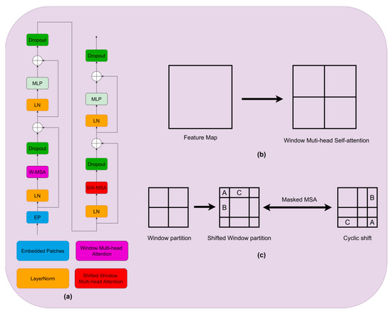 (a) Overall architecture of the Swin Transformer blocks; (b) W-MSA, where the feature map is windowed to calculate self-attention; and (c) SW-MSA, where the sliding window is followed by a mask with a moving local window to achieve the equivalent of four windows to calculate self-attention.