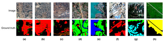 The GID dataset [46] is a high-resolution remote sensing image dataset collected by Wuhan University for land use classification from December 2014 to October 2016. It includes 150 high-resolution GF-2 images from more than 60 cities in China, covering a geographical area of over 50,000 km2. Each remote sensing image in the dataset is 6800 7200 pixels, with a spatial resolution of 1 m and consisting of three RGB channels. The six land types considered are building, farmland, water, forest, meadow and background. In this paper, all 150 images are cropped to 512 512 pixels to build the dataset, resulting in 8125 cropped images—similar to the Gwadar dataset—with 80% used for training and 20% for validation and testing. The cropped dataset with the class annotation is shown in Table 3.