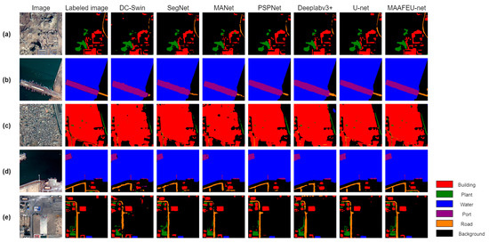 Figure 6 shows the prediction results of the different networks for the Gwadar dataset images. The segmentation results of MAAFEU-net for road and plant in Figure 6a–e are significantly better than the other models, with continuous and clear boundaries due to the ability of MAAFEU-net to reduce the effect of similar features of background and road and plant using the feature enhancement layer. The segmentation map of MAAFEU-net for the port type in Figure 6b has smoother edges compared to the other models, while two smaller ports in the lower right are also clearly segmented in Figure 6d, which indicates that MAAFEU-net captures the connection between port and water and improves the classification accuracy of edge-related pixels. The results show that MAAFEU-net has excellent land classification results for remote sensing images with high pixel complexity and strong type relevance.