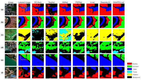 Figure 7 shows the comparison between the prediction results of MAAFEU-net and the other six models for land use classification. MAAFEU-net effectively improves the classification of related pixels and misclassification of similar features relative to the other methods and improves the classification accuracy of the overall type. The orange boxes in the labeled images show the prediction errors from the other models. These errors are mainly found in the fragmented feature type classification, which ignores the links between different land use types and fails to capture the holistic nature of remotely sensed images. In Figure 7a,b, the comparison model does not identify the edges of the building type and the fragmented objects well because many fragmented farmlands, water and other land use types around buildings are not within the scope of the study. Other models usually do not consider the correlation between different types and cannot relate the distribution of adjacent features for classification. Due to the similarity between meadow- and forest-type features in Figure 7c,d and the surrounding environment, the classification is difficult and the comparison model has difficulty in distinguishing the target type from similar feature objects in the background, with poor prediction results. Among them, MANet and DC-Swind present particular challenges in predicting forest and meadow categories. In Figure 6e, MAAFEU-net has the most complete recognition of the farmland category, and the context between farmland is also clearly segmented. In Figure 6f, the water category in the upper left corner is missing in all the comparison models except DC-Swin and MANet. In contrast, MAAFEU-net can effectively extract the difference and connection between building, background and water, and has the best overall segmentation effect. The MAAFEU-net proposed in this paper combines the correlation between adjacent pixels and overall features through the MA module in the feature extraction process and is able to learn the association of different land use types. At the same time, the features of segmented objects are further strengthened through the feature enhancement layer to distinguish the target features from the surrounding background, which improves the classification accuracy of types that are difficult to identify and has greater advantages in land use classification of multi-types remote sensing images.