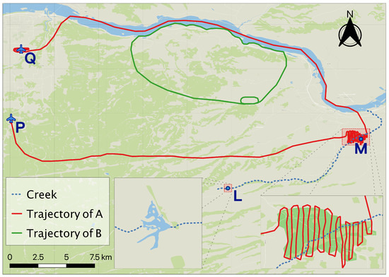 Illustration of Spatio-Temporal Association. Aircraft A takes off from airport Q to farmland M on a pesticide-spraying mission and then lands at airport P. There is an association between A and B due to similar local trajectories; aircraft A hovers repeatedly over farmland M, so there is a strong association between A and M. There is also an association between A and L as creek C passes through farmland M to deliver pesticides to lake L.