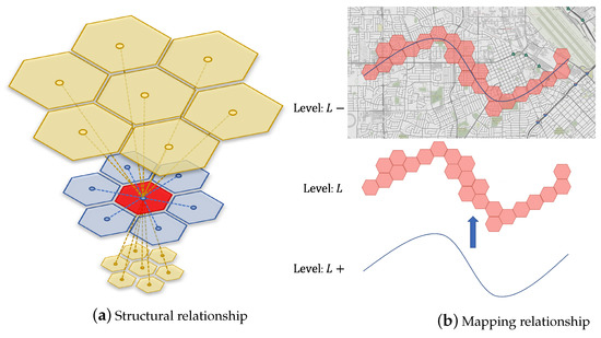 As shown in Figure 3a, the grids that have adjacency relationships with the red grid on the L-level are the blue grids of the same level. The yellow grids at level and have hierarchical relationships with the red grid. Among them, the yellow grids at level are the parent grids of the red grid and its neighboring grids, while the yellow grids at are the child grids of the red grid.