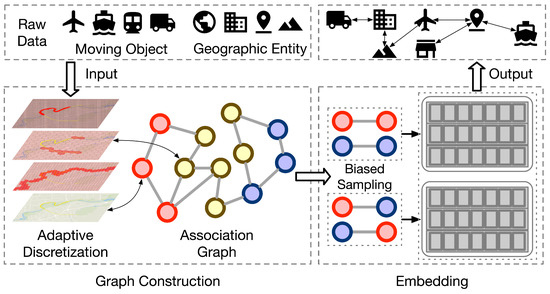 It can be seen that the diverse scale characteristics of spatio-temporal objects are an important factor affecting the results of association analysis. While location embedding studies utilizing fine-grained grids have been shown to preserve more spatio-temporal features [31], sparse data present a challenge whereby computational resources are not efficiently utilized [5]. Multilevel discretization techniques can overcome this limitation by retaining association information at multiple scales. However, implementing such methods requires prior knowledge to set fixed multiple levels [32,33]. Our research addresses these shortcomings by adaptively selecting different resolution grid units for discretization based on the scale size of spatio-temporal objects. This preserves feature information across diverse scales. To describe associations between spatio-temporal objects with varying structures and grids at different levels, we integrate the approaches for spatio-temporal objects and discretized grids using heterogeneous graphs. Association information for spatio-temporal objects is obtained through node embedding. Specifically, the contributions of this paper are as follows: