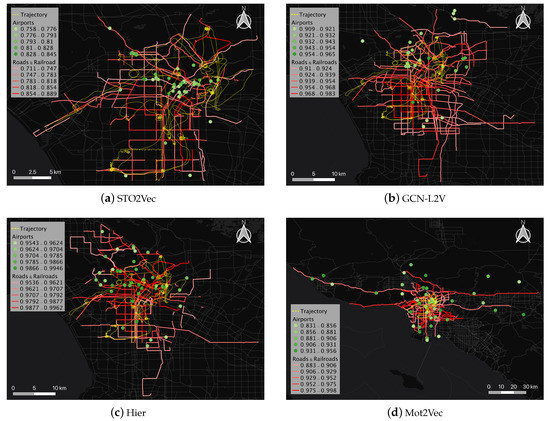 Figure 8a shows the output of STO2Vec; the comparison shows that the associated geographic entities output by STO2Vec are more concentrated in spatial distribution. The strength of association basically matches the spatial characteristics of the trajectory, which can reflect the interaction between this helicopter and various types of geographic entities in urban areas more accurately. Owing to the fact that STO2Vec discretizes the trajectories by segmenting them to different spatial resolutions, it is able to adaptively match the scale size of the trajectories and geographic entities. In data-intensive areas such as urban areas, fine-grained geographic entities are described by a high-level grid that retains most of the spatial characteristics of urban streets, railways, airports, and helicopter trajectories. Furthermore, as can be seen from the color shades of the elements and their corresponding association strength values, STO2Vec has a more dispersed distribution of association strength values than does GCN-L2V and Hier (e.g., 0.758–0.845 for airports and 0.711–0.889 for roads and railroads in Figure 8a); this indicates that the objects are more significantly different in STO2Vec embedding space. Without changing the association structure, the parameters can be set to adjust the sampling trend to the application requirements, which allows the model to learn more information about the interaction between the helicopter and the geographic entities.