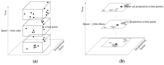 Extraction of crime control points: (a) space–time cubes; (b) centers of crime events.