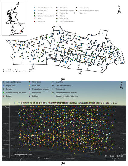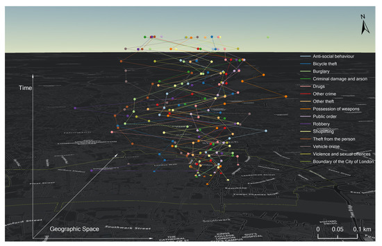 Given that the City of London (2.6 km2) is more developed and provides better information than other places, this study relied on its crime records. Analyzing the latest data is conducive to increasing the value of results. Relatively new data from December 2019 to December 2020 were used in our work; these were the most recent data available when this study started. Moreover, in 2020, the COVID-19 pandemic caused a large degree of crime displacement, making hotspot policing work difficult. Analyzing the dataset from this period is more conducive to demonstrating how crime space–time paths can visualize and analyze these displacements, for crime prevention. Data preprocessing was performed using Python 2.7 and ArcMap 10.2; the steps were as follows: removing missing data, grouping, cropping, and format conversion.