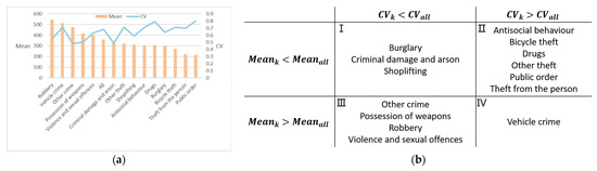 Figure 7b shows the division of crime types based on , , and . Based on the size relationships, 14 crime types can be divided into 4 groups. There were three crime types in Group I: burglary; criminal damage and arson; and shoplifting. There were six crime types in Group II: antisocial behavior; bicycle theft; drugs; other theft; public order; and theft from the person. Group III had four crime types: other crime; possession of weapons; violence and sexual offences; and robbery. Group IV had one type: vehicle crime. As can be seen from Figure 7b, the number of crime types in each group is uneven. There were more crime types in Group 2 and Group 3 than the others, i.e., was inversely proportional to , which was consistent with the “scissor” distribution.