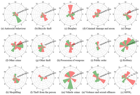 Figure 8 shows rose diagrams of changes in norms over time for crime types’ monthly vectors. For each crime type, the norms had obvious heterogeneity, i.e., the magnitude of norms varied over time, and the months in which the maximum value appeared were different. In terms of morphology, there were crime types with unipolar morphology, such as antisocial behaviour, which shifted significantly in just one month. Bipolar morphology, such as for violence and sexual offences, refers to a significant change in two months. Multipolar morphology, such as for vehicle crime, indicates significant displacements over many months. Figure 8 denotes the trend of any monthly vector’s endpoint relative to its starting point. Each crime type shows an alternating distribution of spread (red) and contraction (green). There was no crime type that continued to spread or contract over a prolonged time.