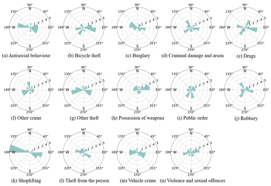 Figure 9 illustrates the frequency of monthly vector directions, including the rose diagrams for 14 crime types, where 360 degrees is divided equally into 16 subregions; the polar angle indicates the direction of monthly vector; the polar diameter indicates the frequency of monthly vectors in the corresponding subregion. For each crime type, the frequency of directions had obvious anisotropy, that is, it varied with the direction and the maximum occurred at different angles. The morphological discontinuity of the rose diagrams was obvious. Some crime types showed a unipolar trend. For example, possession of weapons showed a single direction of crime displacement. In addition, violence and sexual offences showed a bipolar trend, shifting mainly in two directions. For multipolar crime types such as drugs, the main directions of displacement were multiple and not obvious. However, temporal information was ignored in the distribution of monthly vector directions.