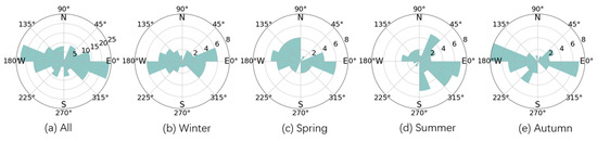 Finally, the number of subregions for rose diagrams (Figure 9) required specification. Geographic space can usually be divided into 4, 8, 16, 32 direction subregions. As with the raster scale, the larger the number of subregions, the higher the accuracy. Too many or too few subregions are not conducive to the statistical analysis of directions. Given that there are 12 monthly vectors of a space–time path, 16 direction subregions are sufficient.