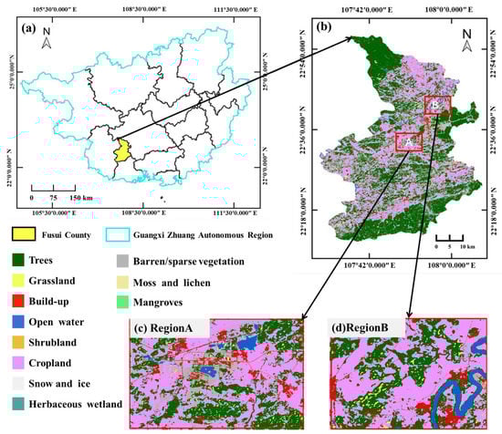 Location map of the study area. (a) Study area; (b) Esri 2021 landcover map; (c) and (d) are detailed landcover maps of Region A and Region B, respectively.