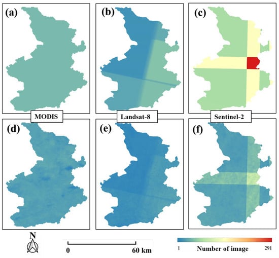 The number of scenes from MODIS, Landsat-8, and Sentinel-2 over Fusui County in 2021. Spatial distribution of the original images for MODIS (a), Landsat-8 (b), and Sentinel-2 (c). Spatial distribution of the cloud-free image (obtained by removing clouds using QA) for MODIS (d), Landsat-8 (e), and Sentinel-2 (f).
