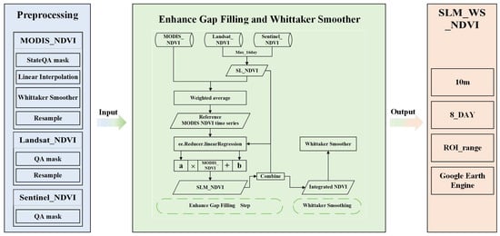 In this study, we proposed the EGF-WS method to reconstruct high spatiotemporal resolution NDVI time series. This process involves three main steps, that is, firstly, the MODIS image collection was preprocessed to generate cloud-free MODIS NDVI as a reference NDVI time series, providing high temporal resolution NDVI. The Sentinel–Landsat NDVI (SL-NDVI) time series at 16-day intervals were generated using the maximum synthesis method. Secondly, a new NDVI time series, Sentinel–Landsat–MODIS NDVI (SLM-NDVI), was generated using the enhance gap-filling method to fill in the missing values of the SL-NDVI images, thereby providing NDVI with high spatial resolution. Finally, we smoothed the SLM-NDVI time- series data by employing the Whittaker smoothing (WS) method to generate Sentinel–Landsat–MODIS Whittaker smoothing NDVI (SLM-WS-NDVI) time series with both high temporal and high spatial resolution. The schematic diagram illustrating the flow of EGF-WS processing is shown in Figure 3.