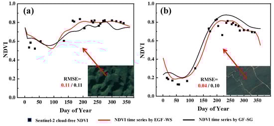 To assess the reasonableness of the NDVI time series accuracy after EGF-WS reconstruction, considering its practical application, two distinct land cover types were selected in Region A and Region B: evergreen vegetation in Figure 6a, and agricultural land in Figure 6b. Subsequently, time series curves were plotted for these land cover types, and the RMSE of EGF-NDVI and GF-NDVI was calculated in comparison with Sentinel-2 NDVI to assess their accuracies.