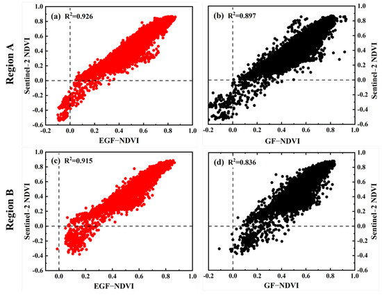 Scatter plots of EGF-NDVI, GF-NDVI vs. Sentinel-2 NDVI for the year 2021. (a) is EFG −NDVI and (b) is GF −NDVI, in region A, (c) is EFG −NDVI and (d) is GF −NDVI, in region B. The red dots are EGF−WS fusion results, and the black dots are GF−SG fusion results, with R2 also given.