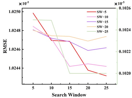 To evaluate the accuracy of NDVI after reconstruction using different search windows and smoothing windows, the RMSE of EGF-NDVI and Sentinel-2 NDVI were calculated in step 5, as shown in Figure 8.